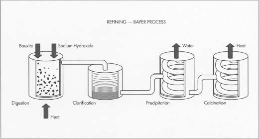 - 1 The Bayer process used to refine bauxite comprises four steps: digestion, clarification, precipitation, and calcination. During the digestion stage, the bauxite is ground and mixed with sodium hydroxide before being pumped into large, pressurized tanks. In these tanks, called digesters, the combination of sodium hydroxide, heat, and pressure breaks the ore down into a saturated solution of sodium aluminate and insoluble contaminants, which settle to the bottom.
